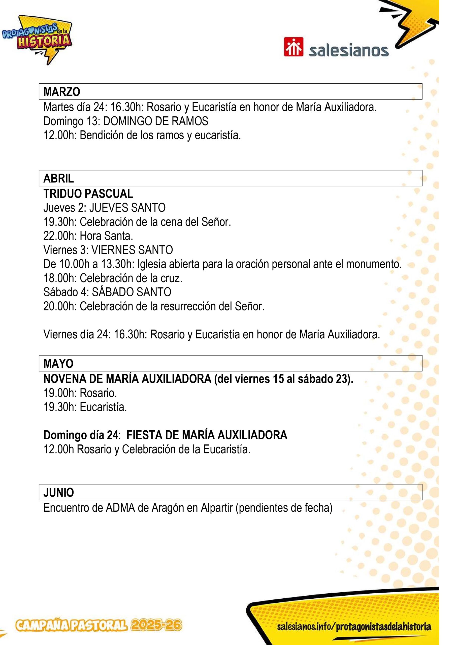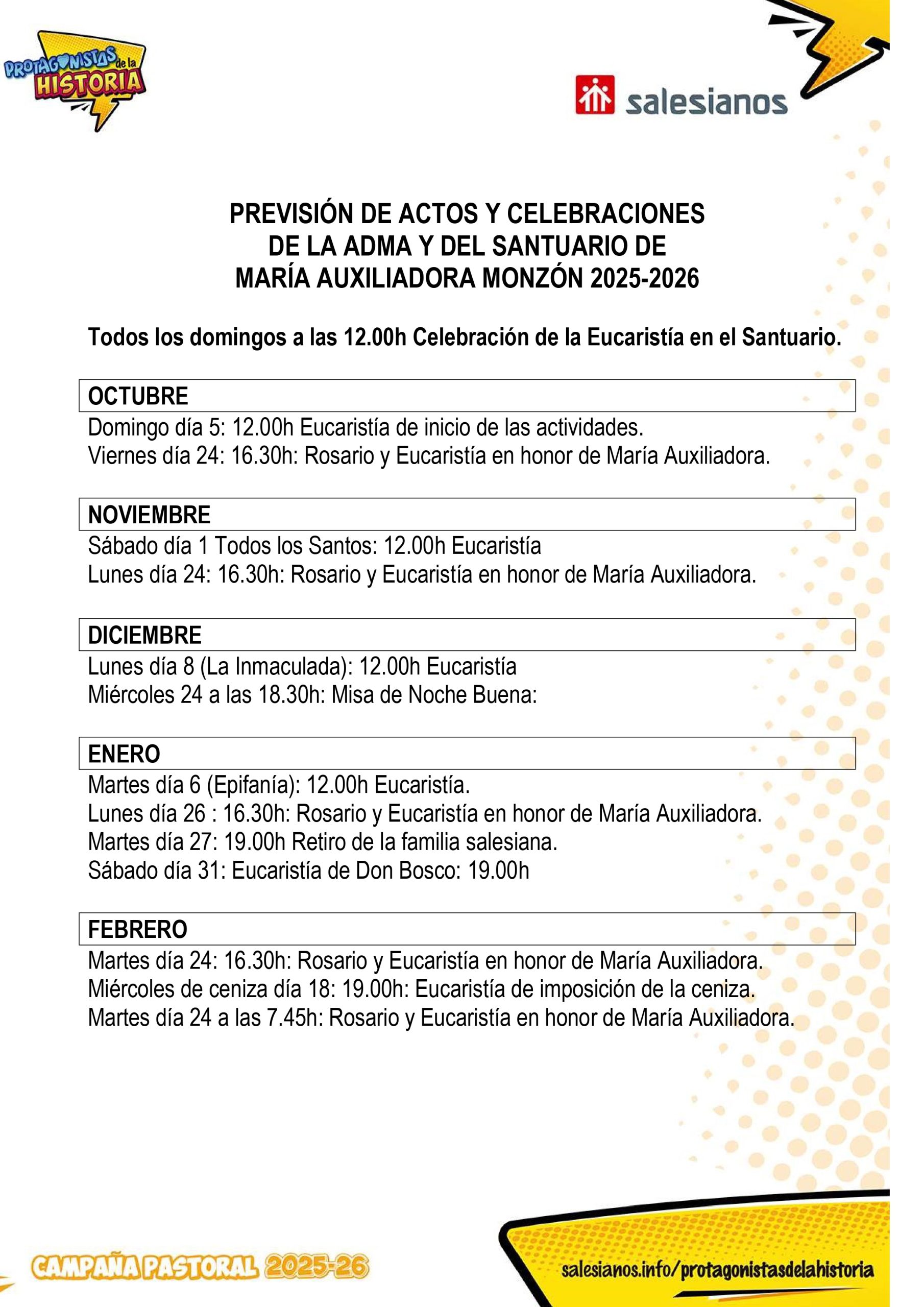 Iglesia María AuxiliadoraPara vivir la fe en comunidad Para rezar Rezando voy Misa dominical Se celebra la Eucaristía los domingos a las 12:00h en un ambiente muy familiar, con cantos de guitarra y participación de los asistentes en las lecturas. Salesianos En el mundo En España En la Inspectoría Agencia noticias Boletín Salesiano